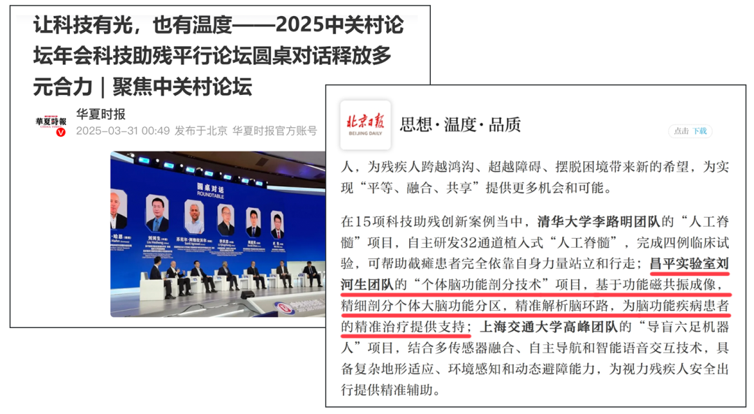 日前,2025中关村论坛年会在京盛大举行。今年首设科技助残平行论坛,主题为“科技有爱,共创美好世界”,论坛现场发布15项科技助残创新案例,刘河生教授团队的“个体脑功能剖分(pBFS)技术”项目入选,获现场众多嘉宾及《北京日报》《华夏时报》等媒体关注。